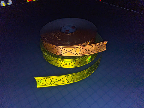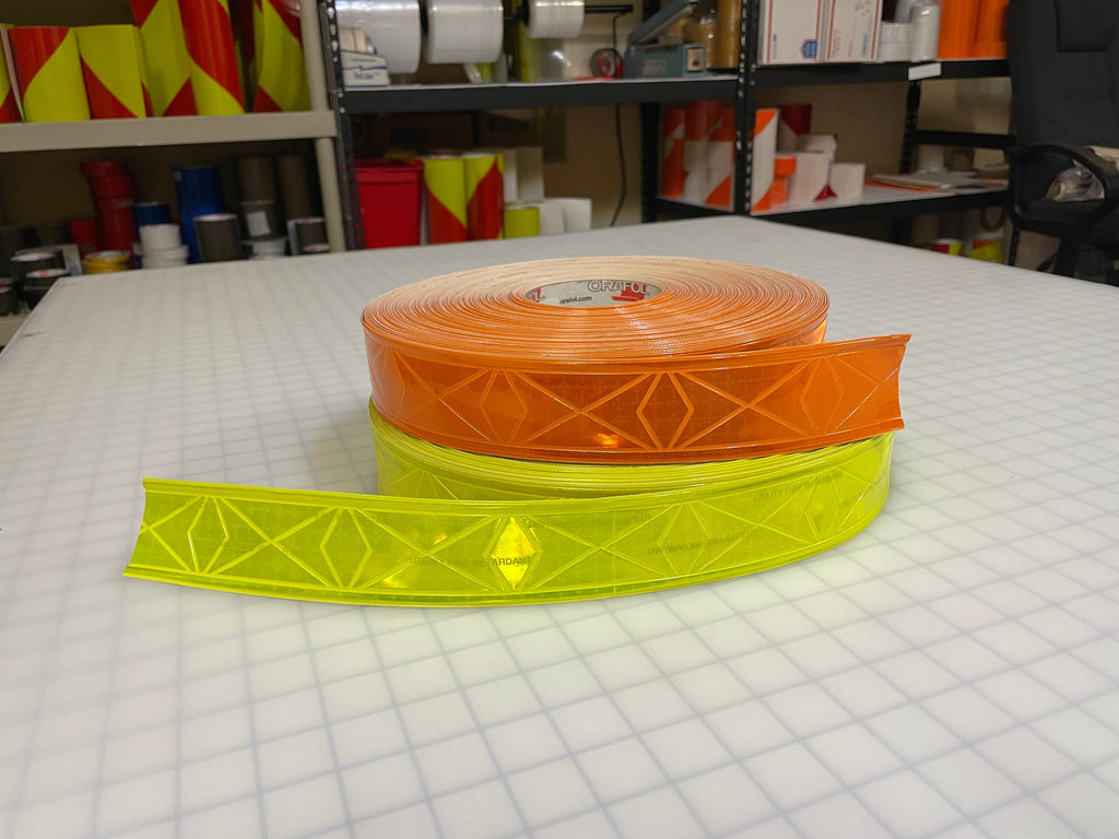 Oralite UFR - Utility Fire Retardant Garment Trim is a PVC based air backed prismatic trim backed by a fire retardant fabric. This is a sew on garment trim that is used on fire resistant apparel. We carry Fluorescent Lime and Orange colors. Sold by the foot on this page. Multiple foot orders sent as a continuous roll.